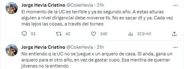El comunicador agrega: “y no entiendo que la UC no se juegue por un arquero de casa. Si anda, gana un arquero para el otro año en vez de gastar cupo. Esa mentira de quemar jóvenes no la entiendo”.