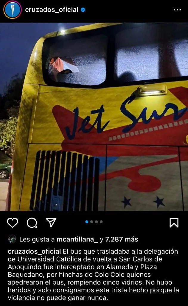 “El bus que trasladaba a la delegación de Universidad Católica de vuelta a San Carlos de Apoquindo fue interceptado en Alameda y Plaza Baquedano, por hinchas de Colo Colo quienes apedrearon el bus, rompiendo cinco vidrios”, comienzan explicando en sus redes sociales.