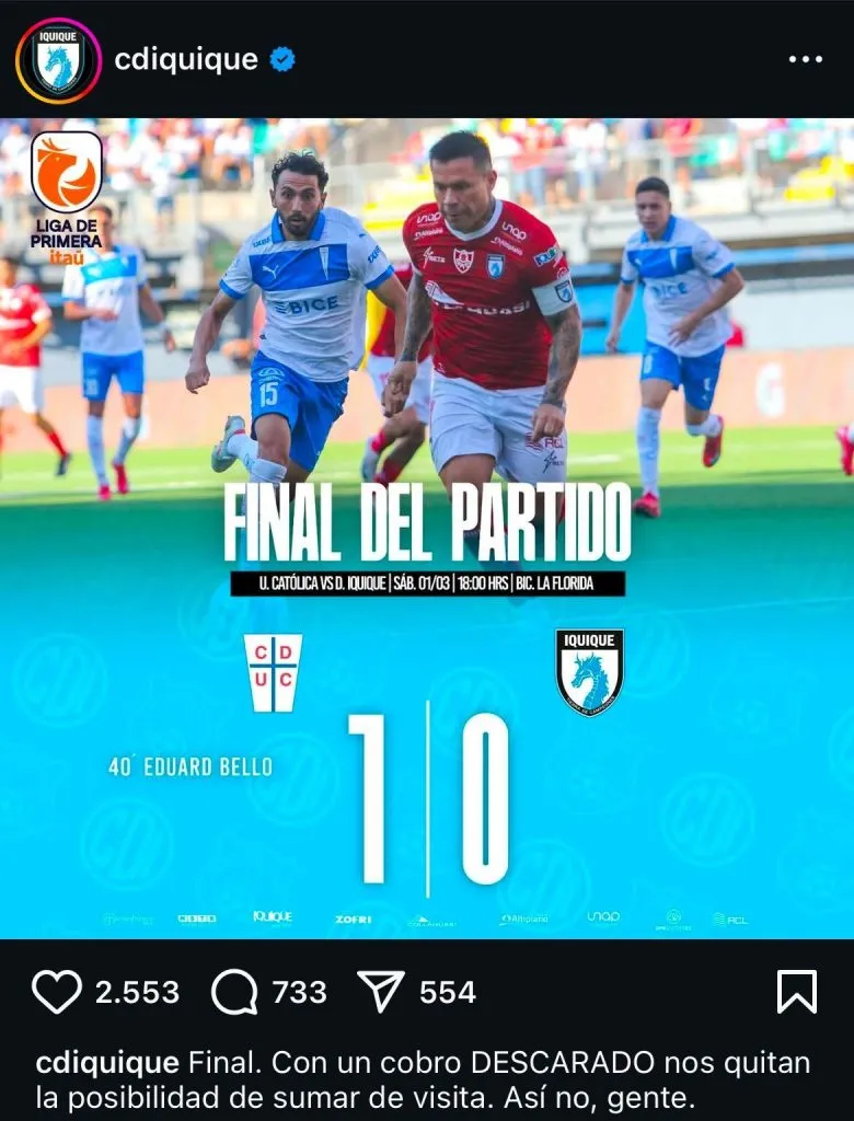 Fue en las plataformas digitales de Deportes Iquique donde no se guardaron nada por la situación vivida ante Universidad Católica, donde aseguran que fue un cobro “descarado”.