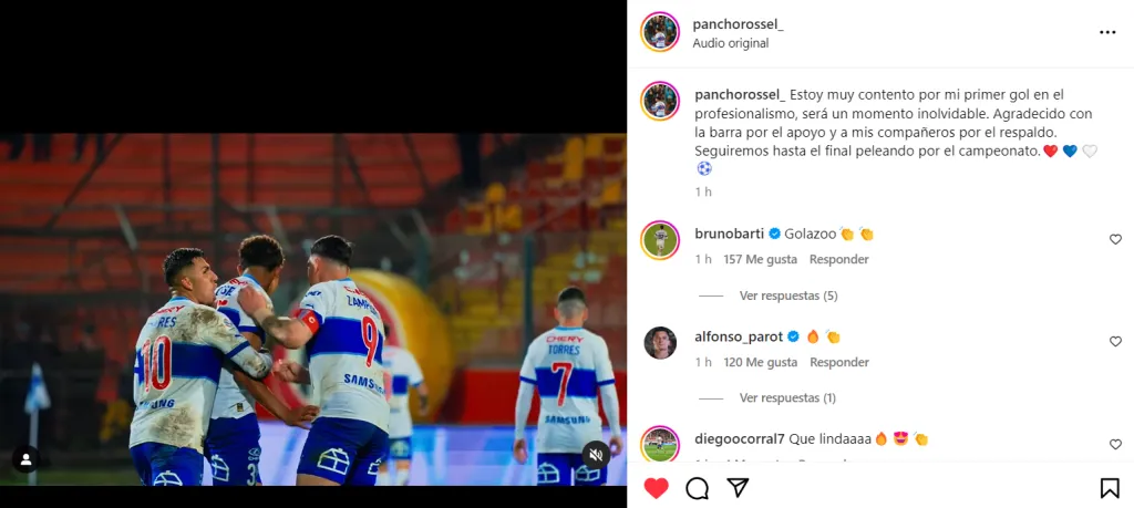 Barti había festejado un golazo en uno de los clásicos de Córdoba y también aplaudió el que anotó Rossel para la UC frente al Tino en la 18° jornada del Campeonato Nacional 2024. “Golazooo”, escribió el atacante de Talleres en los comentarios de Instagram de Pancho.