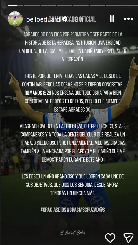 A través de sus redes sociales, el jugador compartió un emotivo mensaje para despedirse de Universidad Católica. “Agradecido con Dios por permitirme ser parte de la historia de esta hermosa institución, Universidad Católica, de la cual me llevo un cariño muy especial en mi corazón”.