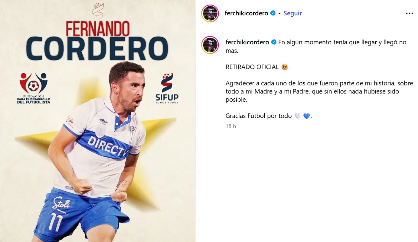 Esta semana, un jugador con una larga carrera en el Campeonato Nacional anunció que se retira oficialmente de las canchas con 38 años. Fernando Cordero, confirmó que cuelga los botines tras casi dos décadas en el profesionalismo.