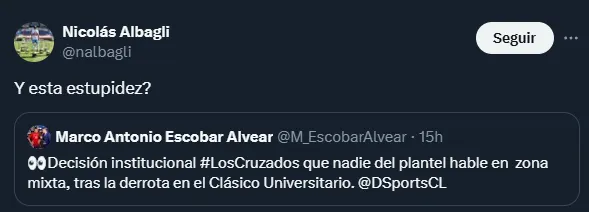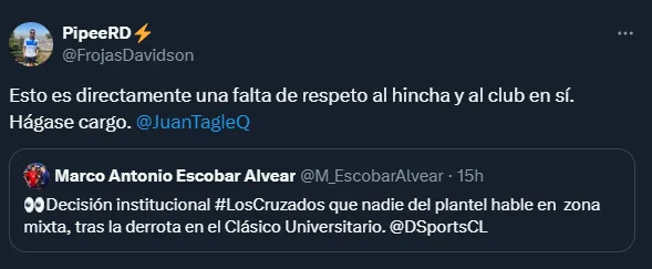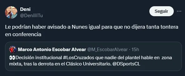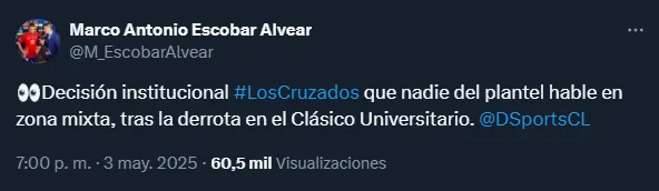 “Decisión institucional #LosCruzados que nadie del plantel hable en zona mixta tras la derrota en el Clásico Universitario“, señaló el profesional de la cadena deportiva internacional.