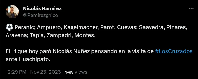 “Pienso que el equipo creció desde lo futbolístico en algunas cosas. Tenemos que tratar de sostenerlas. Huachipato se siente dominante en el juego, es un equipo durísimo. Es un desafío mayor”, aseguró el DT, Nicolás Núñez, en la conferencia de prensa de este jueves 23 de noviembre. El equipo se ratificó una hora antes del partido.