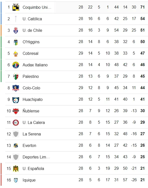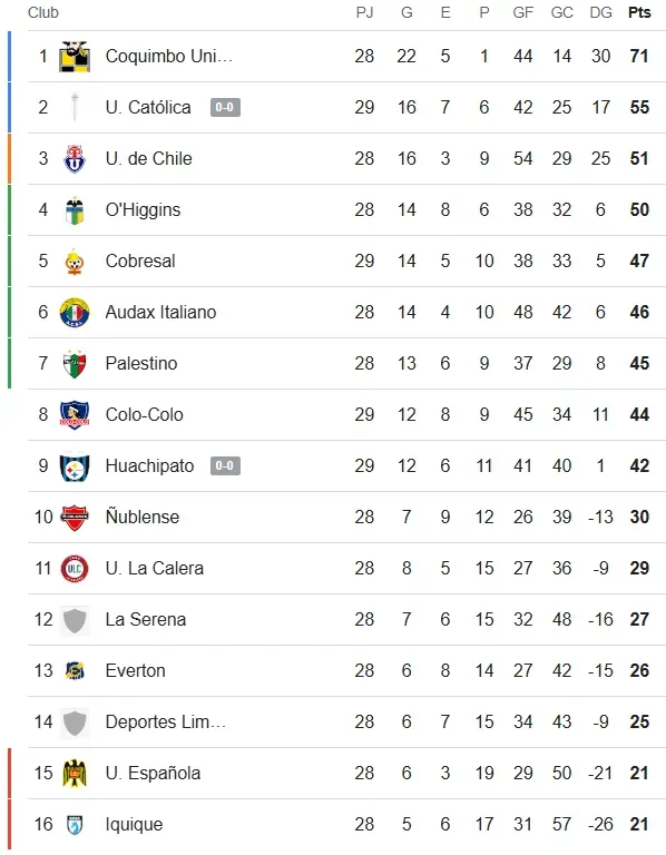 Con el empate la UC se mantiene segunda con 55 puntos, superando por ahora a Universidad de Chile (tercera con 51) por el Chile 2. Los azules juegan el martes ante Coquimbo Unido, con la posibilidad de que, una derrota del Chuncho le entregue definitivamente a La Franja el boleto directo a Copa Libertadores por adelantado. Huachipato es noveno con 42 unidades.