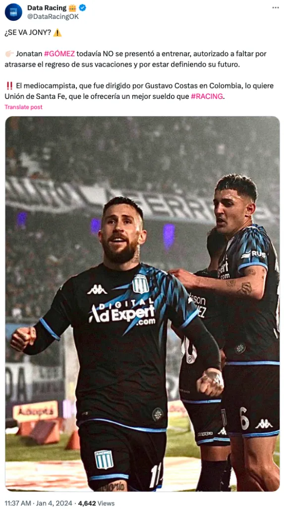 Se trata de Unión de Santa Fe, equipo que se metió por los palos en los últimos días y cuya propuesta gustó más a Racing que la realizada por la UC. El Tatengue busca comprar el pase de Gómez y llevárselo de manera definitiva, que era precisamente lo que quería el elenco dirigido por Gustavo Costas.