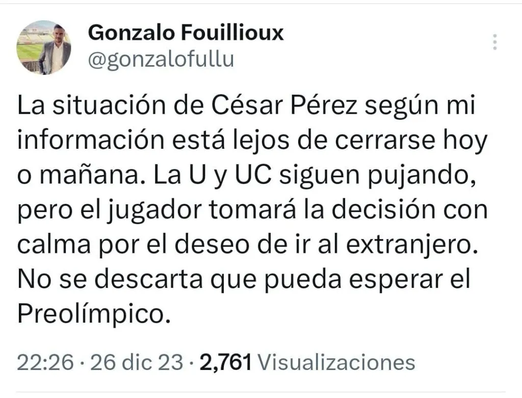 El principal es César Pérez, jugador de Unión La Calera y de la Selección Chilena Sub 23. La UC busca reforzarse con el futbolista desde mediados del 2023, pero no se dio en el mercado de mitad de año y ahora tampoco se está dando de cara al próximo año.