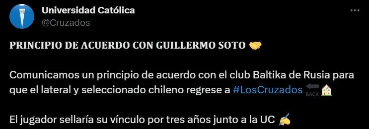 Este sábado 13 de enero, Universidad Católica informó que la negociación para el fichaje de Soto llegó a un punto culminante. Lo hizo mediante sus canales oficiales. “Comunicamos un principio de acuerdo con el club Baltika de Rusia para que el lateral y seleccionado chileno regrese a Los Cruzados”, rezaba el tuit que informó la contratación.