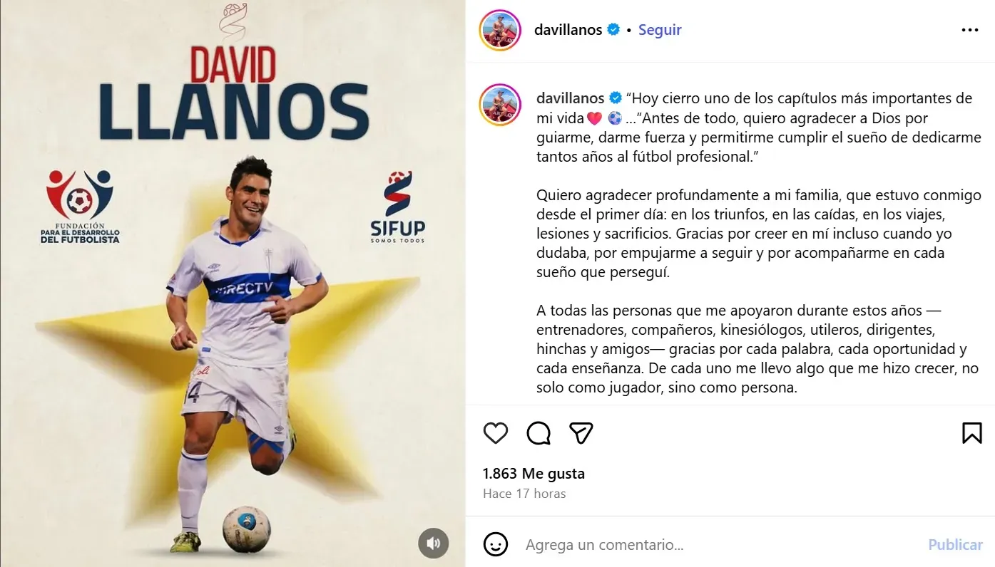 En la publicación, el jugador que pasó por clubes como Huachipato, Deportes Concepción, Palestino y Rangers, señaló: “Hoy cierro uno de los capítulos más importantes de mi vida. Antes de todo, quiero agradecer a Dios por guiarme, darme fuerza y permitirme cumplir el sueño de dedicarme tantos años al fútbol profesional”.