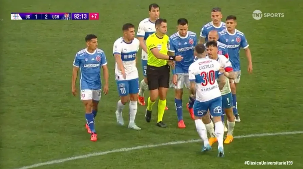 Entre Nicolás Guerra y Charles Aránguiz, autor del gol del empate azul, fueron a frenarlo. Algo que también intentó hacer Tiago Nunes. Los insultos de Castillo iban para Fabián Hormazábal. Pero afortunadamente el Toro Zampedri estaba cerca para custodiar que todo quedara ahí.