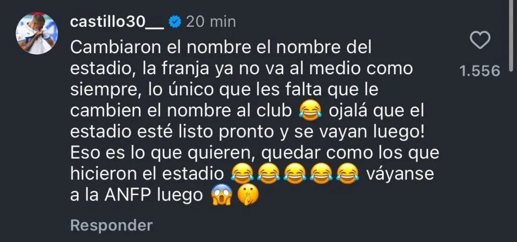 Pero Castillo no quedó allí en sus comentarios hacia la institución que lo vio nacer y que le despidió tras su mala campaña en 2024. “¡Ojalá que el estadio esté listo pronto y se vayan luego!“.
