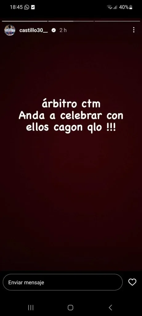 “Árbitro ctm, anda a celebrar con ellos cagón qlo”, escribió Nicolás Castillo en sus historias de Instagram, poseído por el espíritu de Pablo de Rokha.
