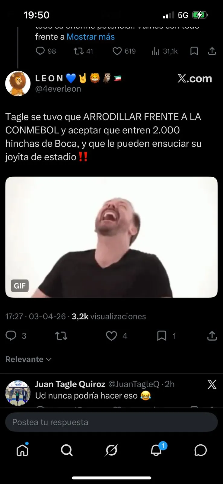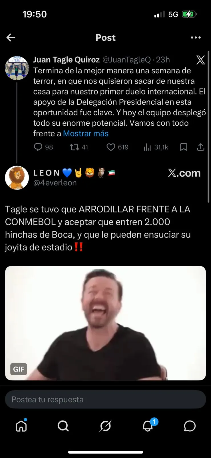 A eso, un hincha azul respondió de inmediato, a través de la misma red social: “Tagle se tuvo que ARRODILLAR FRENTE A LA CONMEBOL (sic) y aceptar que entren 2.000 hinchas de Boca, y que le pueden ensuciar su joyita de estadio”.