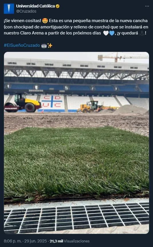 “Esta es una pequeña muestra de la nueva cancha (con shockpad de amortiguación y relleno de corcho) que se instalará en nuestro Claro Arena a partir de los próximos días”, agregó la cuenta oficial del club compartiendo la primera muestra a ras de cancha.