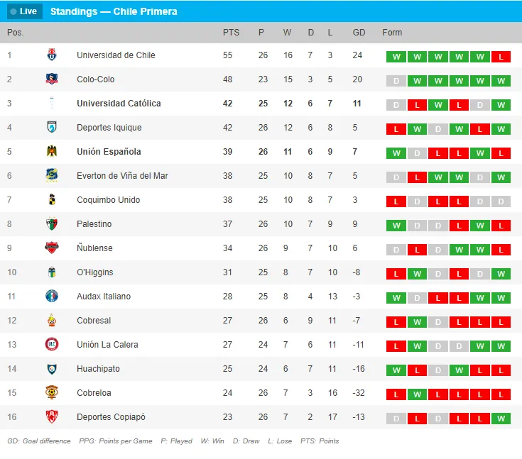 Así las cosas, Universidad Católica comienza a despedirse del título, pues se queda en el tercer lugar con 42 unidades, a 13 del puntero y si llega a perder el Clásico con Colo Colo, se queda sin chances matemáticas de ir por el campeonato.