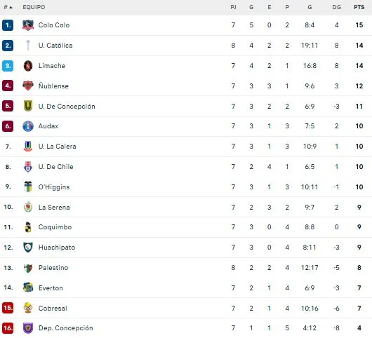 El Tino tiene ocho puntos, uno más que Everton y Cobresal, que comparten el penúltimo lugar. Colista absoluto es Deportes Concepción, que tiene cuatro unidades en la tabla.