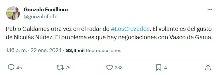 Es que según reporta el periodista Gonzalo Fouillioux, en su cuenta de X, el volante Pablo Galdames, de 27 años, y actualmente en el Genoa de Italia, “otra vez en el radar de Los Cruzados y es del gusto de Nicolás Núñez”, aunque advierte un detalle no menor.