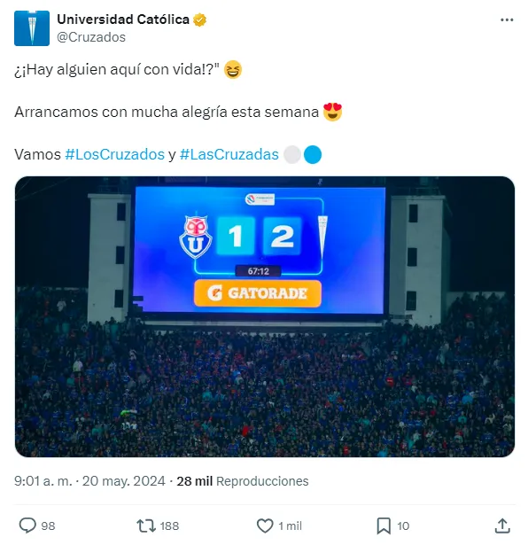 No solo fue Nicolás Castillo. Desde Universidad Católica disfrutan todavía del triunfo en el Clásico Universitario 198, y la vitrina más potente que poseen para dar a conocer su estado es en redes sociales. Claro, lo hicieron acordándose de Universidad de Chile.