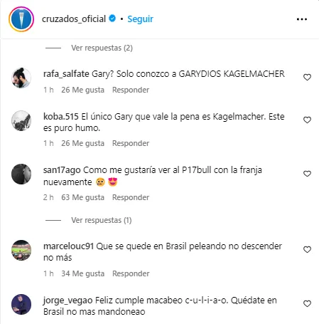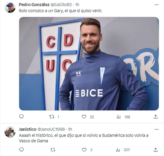 Sin embargo, pasó todo lo contrario. Los usuarios de la UC rápidamente cayeron con todo el odio al posteo dedicado a Gary Medel, sacándole en cara su partida al Vasco da Gama antes de su regreso al conjunto cruzado.