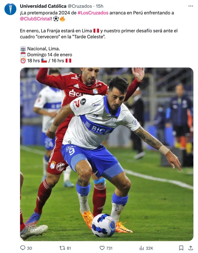 El partido ante el cuadro peruano será el domingo 14 de enero en el estadio Nacional de Lima. El evento comenzará a las 12:00 horas con la presentación de todas sus estrellas para esta temporada; cuatro horas después, a las 18:00 horas de Chile, le darán el puntapié inicial al partido ante la UC.