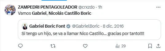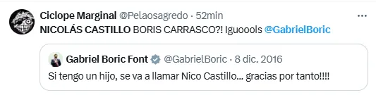 Toda esta noticia generó que un antiguo tweet bastante cruzado de Gabriel Boric se comenzará a viralizar. Este data del 8 de diciembre del 2016, cuando el por entonces diputado afirmó que si tenía un hijo, este se llamaría Nicolás Castillo.