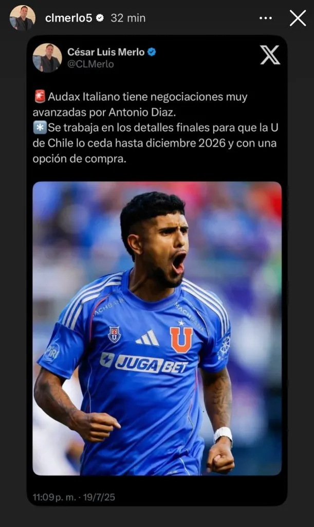 “Audax Italiano tiene negociaciones muy avanzadas por Antonio Díaz. Se trabaja en los detalles finales para que la U de Chile lo ceda hasta diciembre del 2026 y con una opción de compra”.