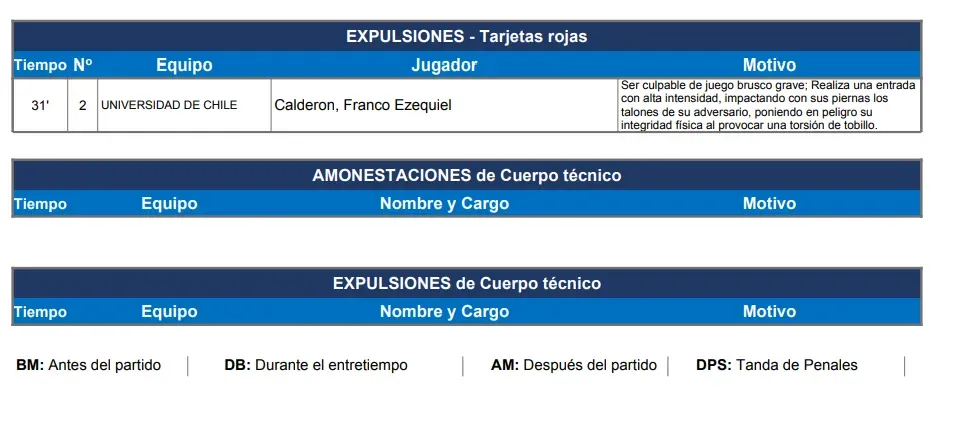 “Ser culpable de juego brusco grave; Realiza una entrada con alta intensidad, impactando con sus piernas los talones de su adversario, poniendo en peligro su integridad física al provocar una torsión de tobillo”, detalló el árbitro.