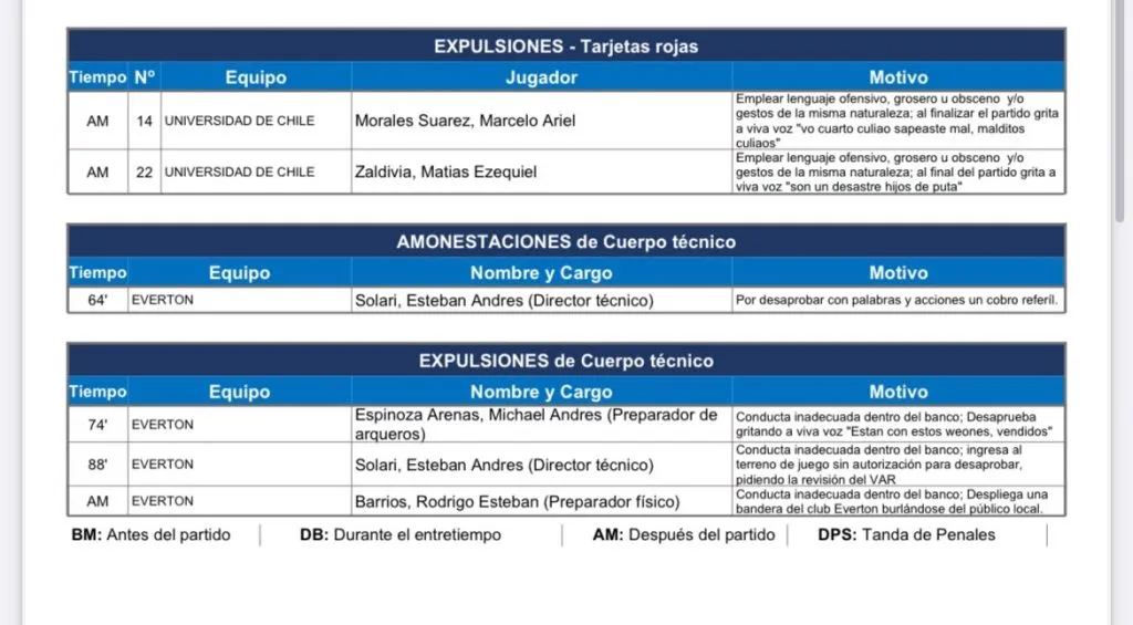 Por otra parte, también detalla lo que les dijo Matías Zaldivia, quien también fue expulsado: “Emplear lenguaje ofensivo, grosero u obsceno y/o gestos de la misma naturaleza; al final del partido grita a viva voz “son un desastre hijos de pu..”.
