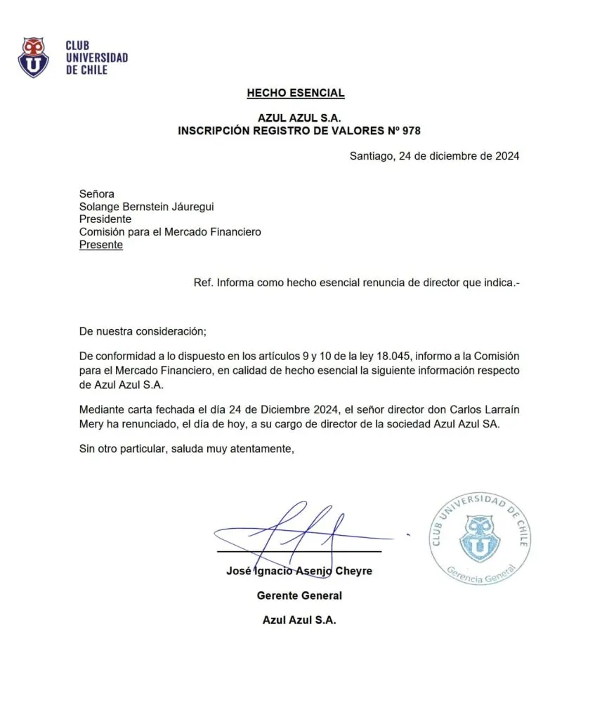 “Mediante carta fechada el día 24 de diciembre de 2024, el señor director don Carlos Larraín Mery ha renunciado, el día de hoy, a su cargo de director de la sociedad Azul Azul S.A.”, detalló.