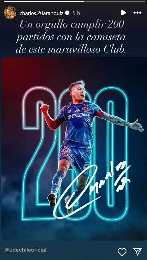 Además, el propio Aránguiz decidió replicar esta noticia. “Un orgullo cumplir 200 partidos con la camiseta de este maravilloso club“, escribió Charles en una historia de Instagram.