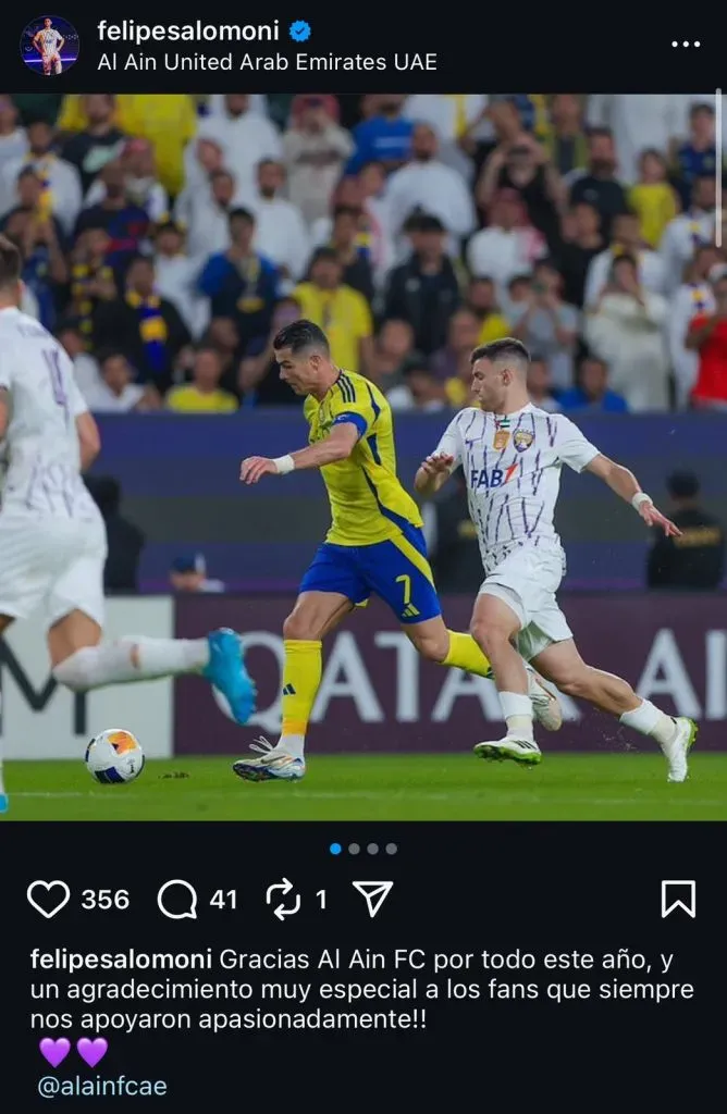Felipe Salomoni empieza a pavimentar el camino para ser refuerzo de Universisad de Chile, luego de una particular despedida desde el Al Ain de Emiratos Árabes Unidos.