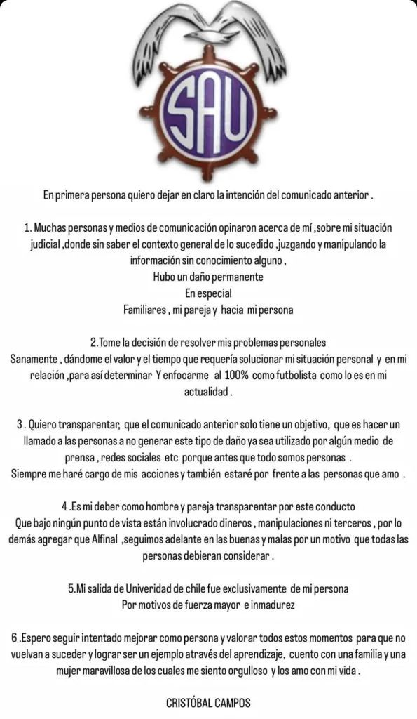 Fue en su cuenta de Instagram donde Cristóbal Campos dejó en claro los motivos que lo obligaron a dejar Universidad de Chile y emprender un nuevo rumbo en el fútbol, que ahora lo tienen disfrutando en San Antonio Unido.
