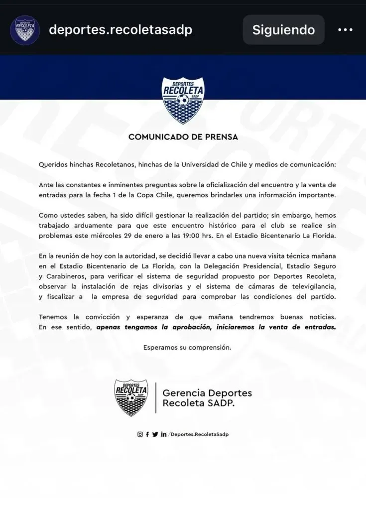 Fue en las plataformas digitales de Deportes Recoleta donde informaron la situación sobre la venta de entradas de Universidad de Chile, la que todavía está a la espera.