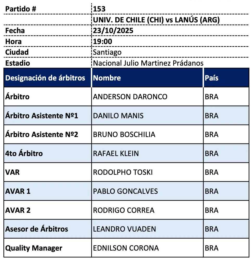 Daronco fue quien impartió justicia en el duelo de ida donde la U derrotó a Independiente por la cuenta mínima, con el gol de Lucas Assadi, y junto a su primer guardalínea y el primer asistente de VAR se repetirán el plato respecto de aquel encuentro del 13 de agosto.