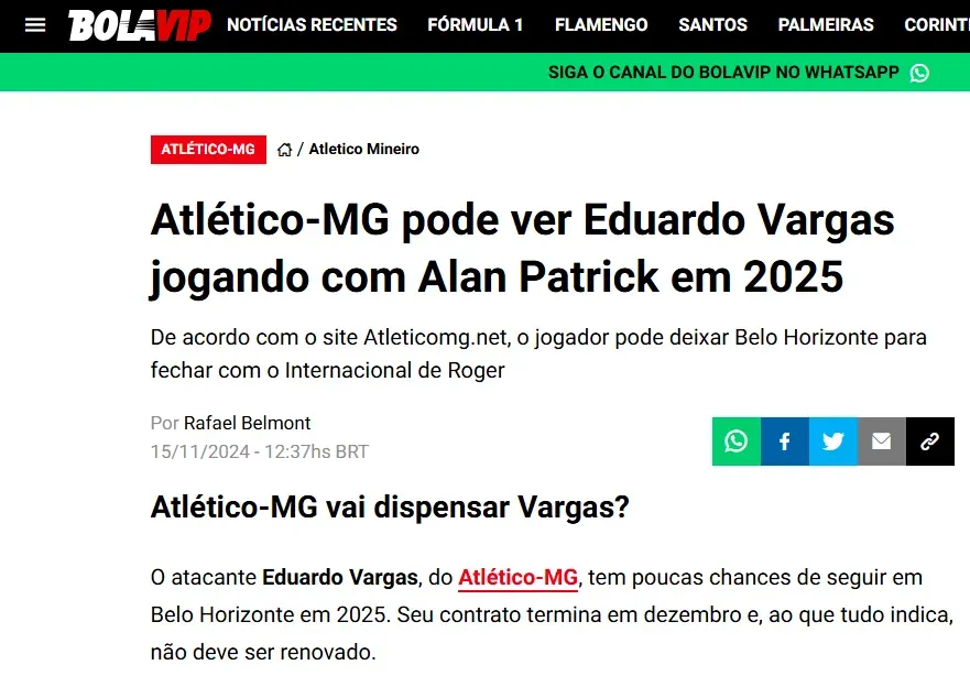 Sin embargo, la familia de Eduardo Vargas no quiere venir a Chile, razón por la cual pierde peso la opción de volver a la U. En ese aspecto, Bolavip Brasil informó que el seleccionado nacional se quedará en ese país y que ya tendría un nuevo equipo.