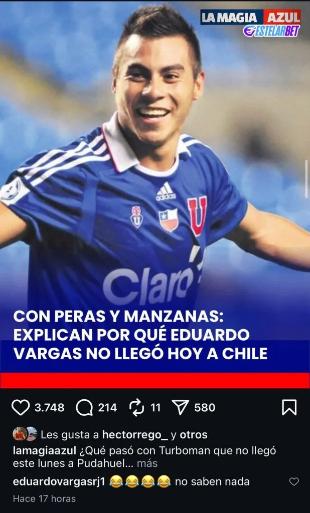 Sin embargo, mayoritariamente, lo que vemos son noticias intentando descifrar lo que se esconde detrás de las negociaciones pantanosas por Edú. Es lo que hizo La Magia Azul, que realizó una nota explicando “con peras y manzanas” las dificultades para la llegada de Eduardo Vargas a la Universidad de Chile.