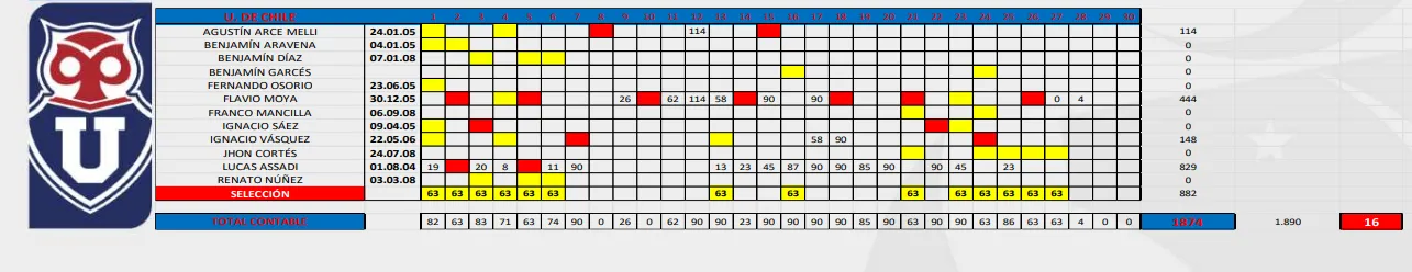 Universidad de Chile debe sumar 16 minutos de los 1890 que se le piden en los dos partidos que quedan por el reglamento de los juveniles, en algo donde sorprende que llevan citado sólo a Flavio Moya.