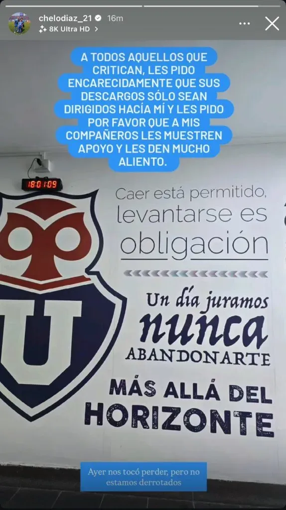 Finalmente, el mensaje lo cierra con un potente mensaje a la hinchada azul. “Ayer nos tocó perder, pero no estamos derrotados”, cerró el capitán de la U.