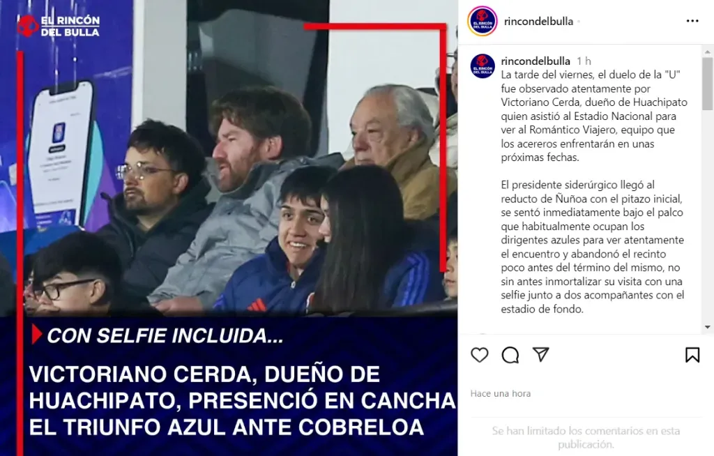 “La tarde del viernes, el duelo de la U fue observado atentamente por Victoriano Cerda, dueño de Huachipato, quien asistió al Estadio Nacional para ver al Romántico Viajero, equipo que los acereros enfrentarán en unas próximas fechas”, manifestó Rincón del Bulla junto a la foto del directivo en el partido.