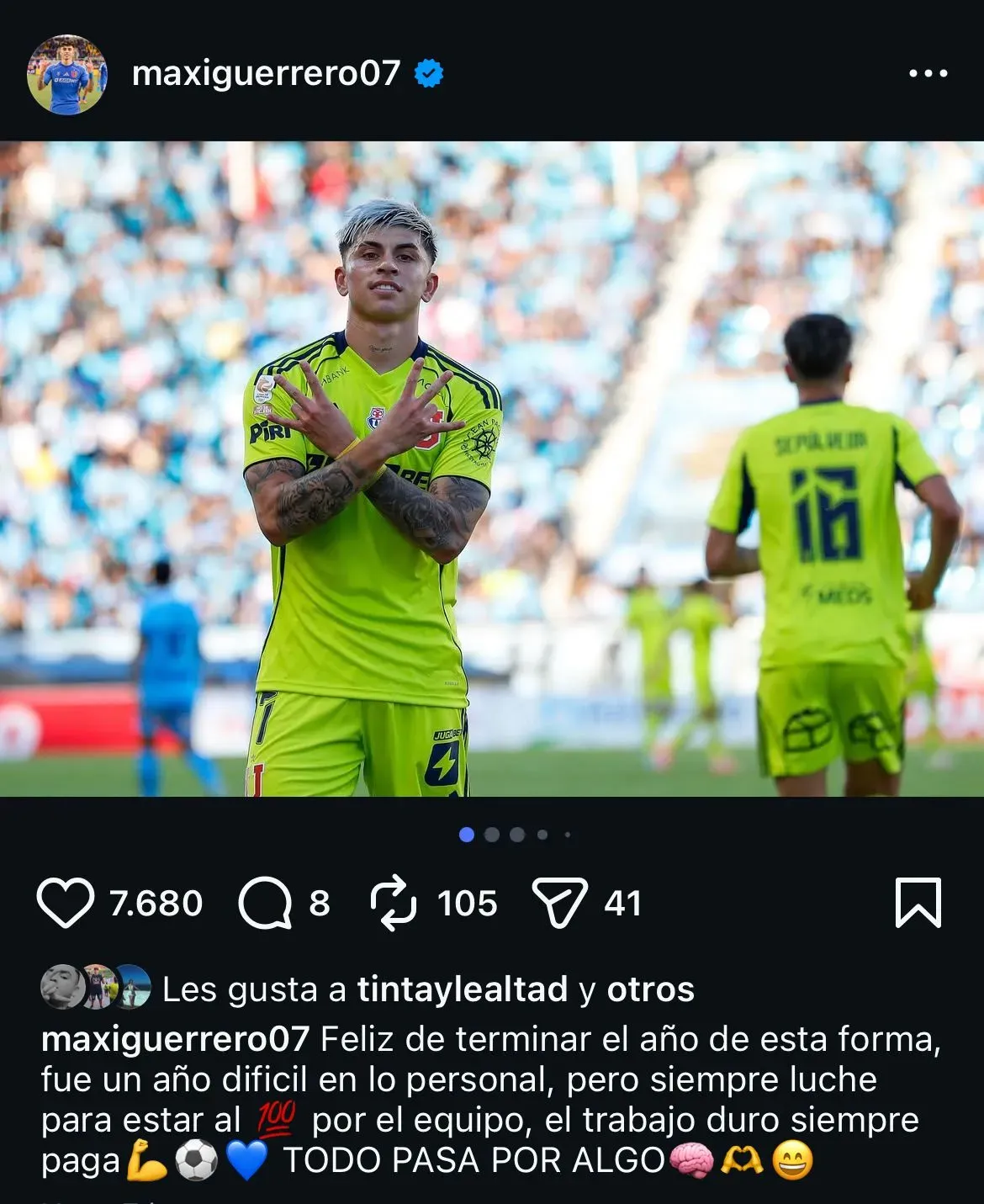 Fue en su Instagram personal donde Maximiliano Guerrero hizo un recuento de la temporada con Universidad de Chile, donde agradece todo lo vivido con sus compañeros.