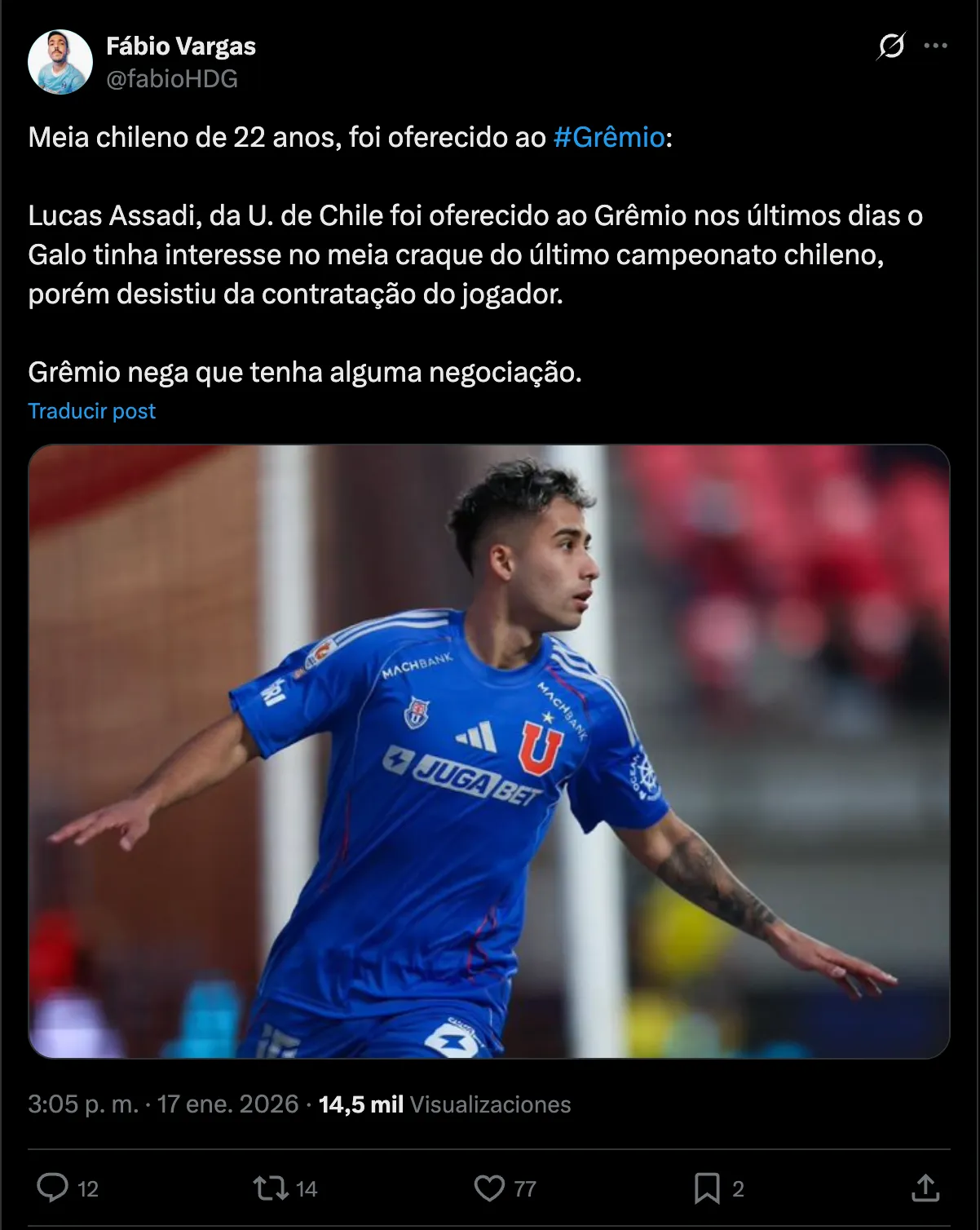 “Lucas Assadi, de Universidad de Chile, fue ofrecido a Gremio hace poco. El Atlético Mineiro se había interesado en el mediocampista estrella del último campeonato chileno, pero desistió de ficharlo. Gremio niega tener alguna negociación“, puntualiza el reportero.