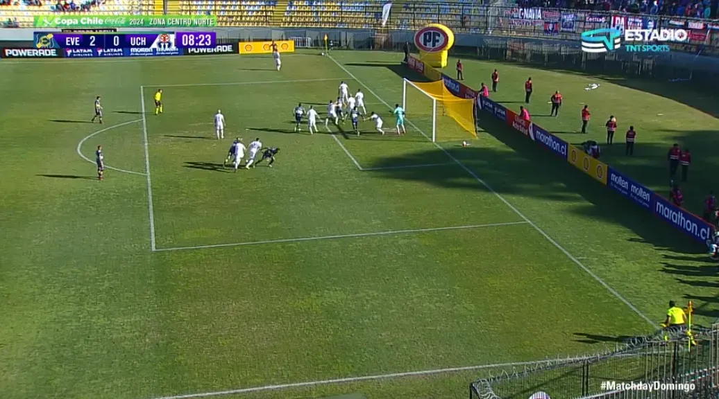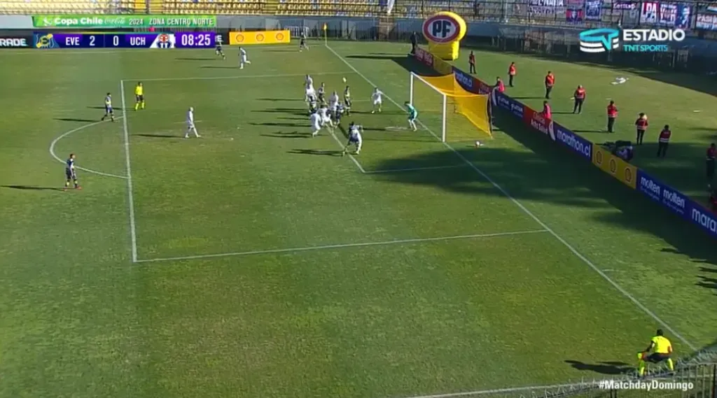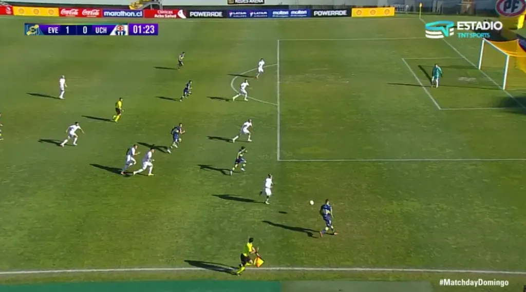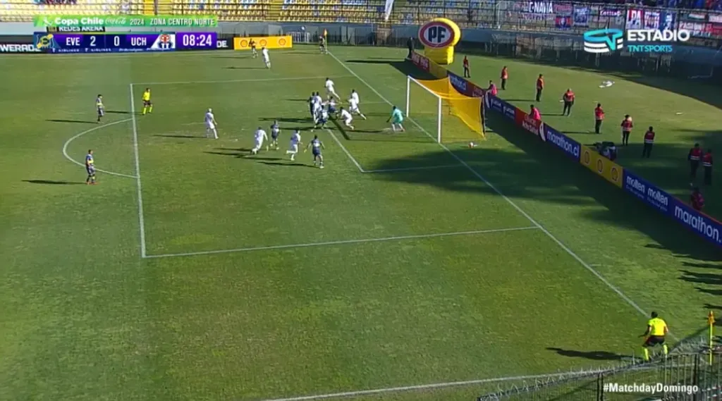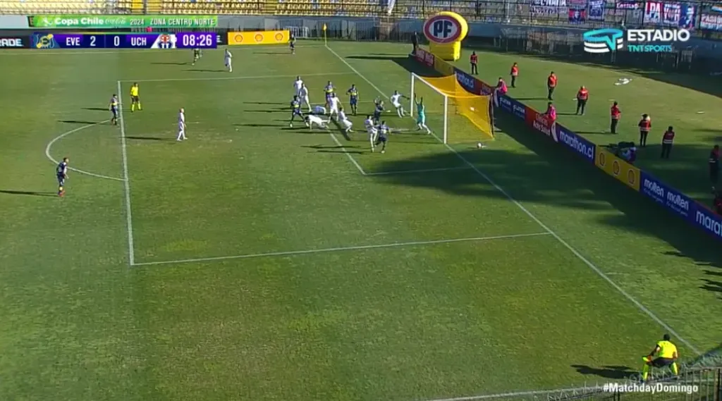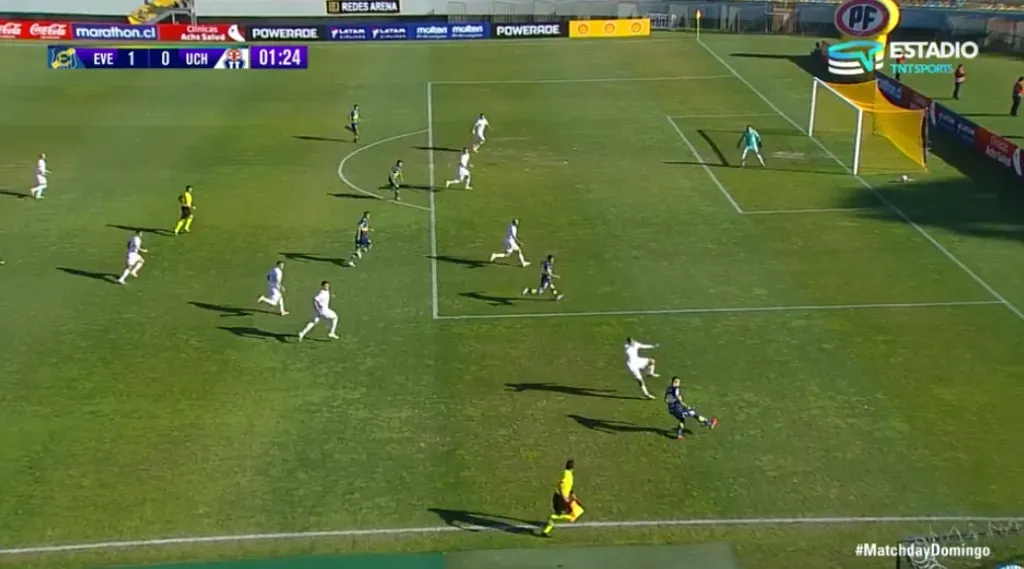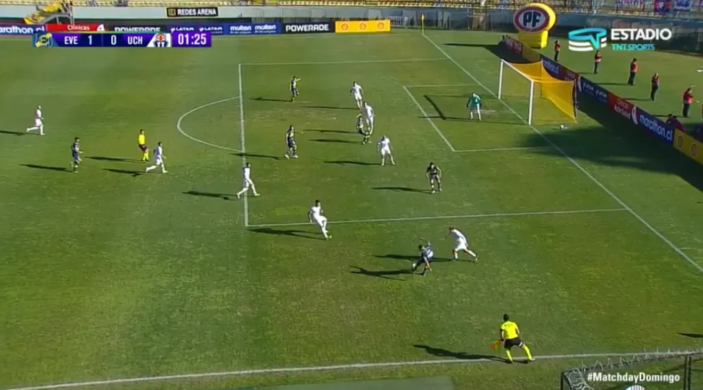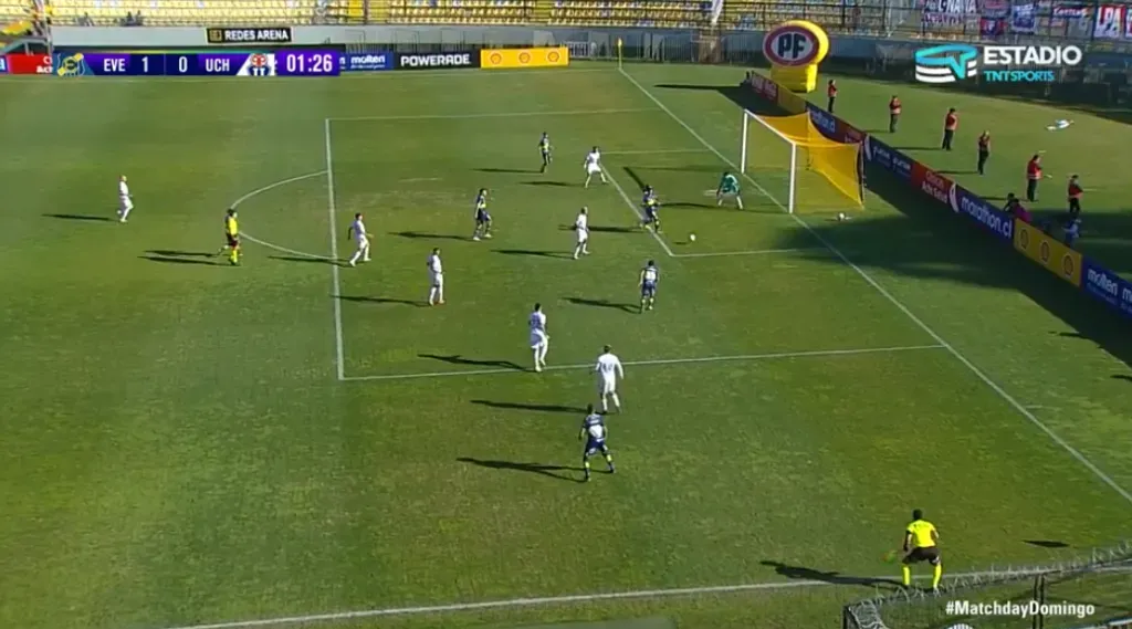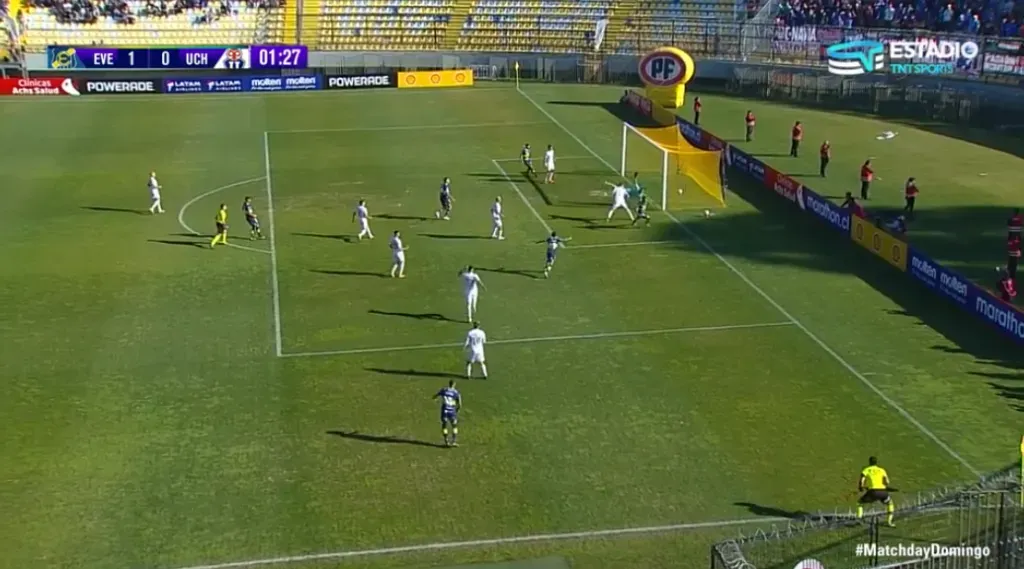 No pasó ni un minuto y ya la U lo perdía. Everton sacó desde el centro, tiraron un pase largo que fue cabeceado hacia el costado por Marcelo Morales y en la reanudación desde el saque de banda, el Tucu Contreras recibió, mandó un centro y Joan Cruz puso el primero. Sólo 24 segundos pasaron desde el pitazo inicial y el gol.