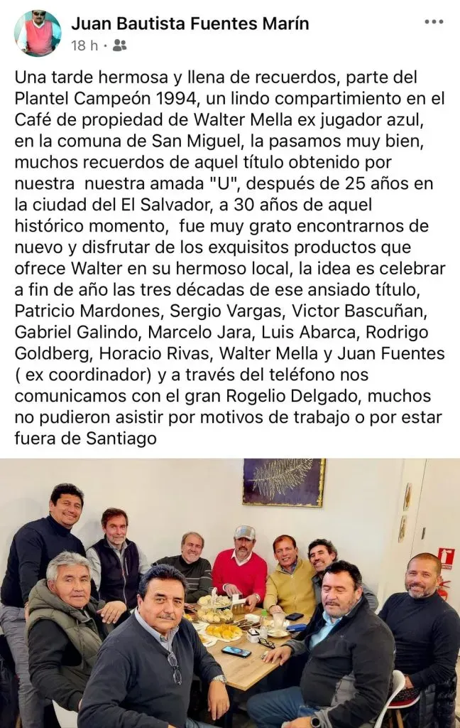 Por lo mismo, un grupo de ex jugadores se juntaron en un café de Walter Mella, ex jugador de la U, para compartir y comenzar a organizar la celebración de las tres décadas del importante triunfo luego de 25 años.
