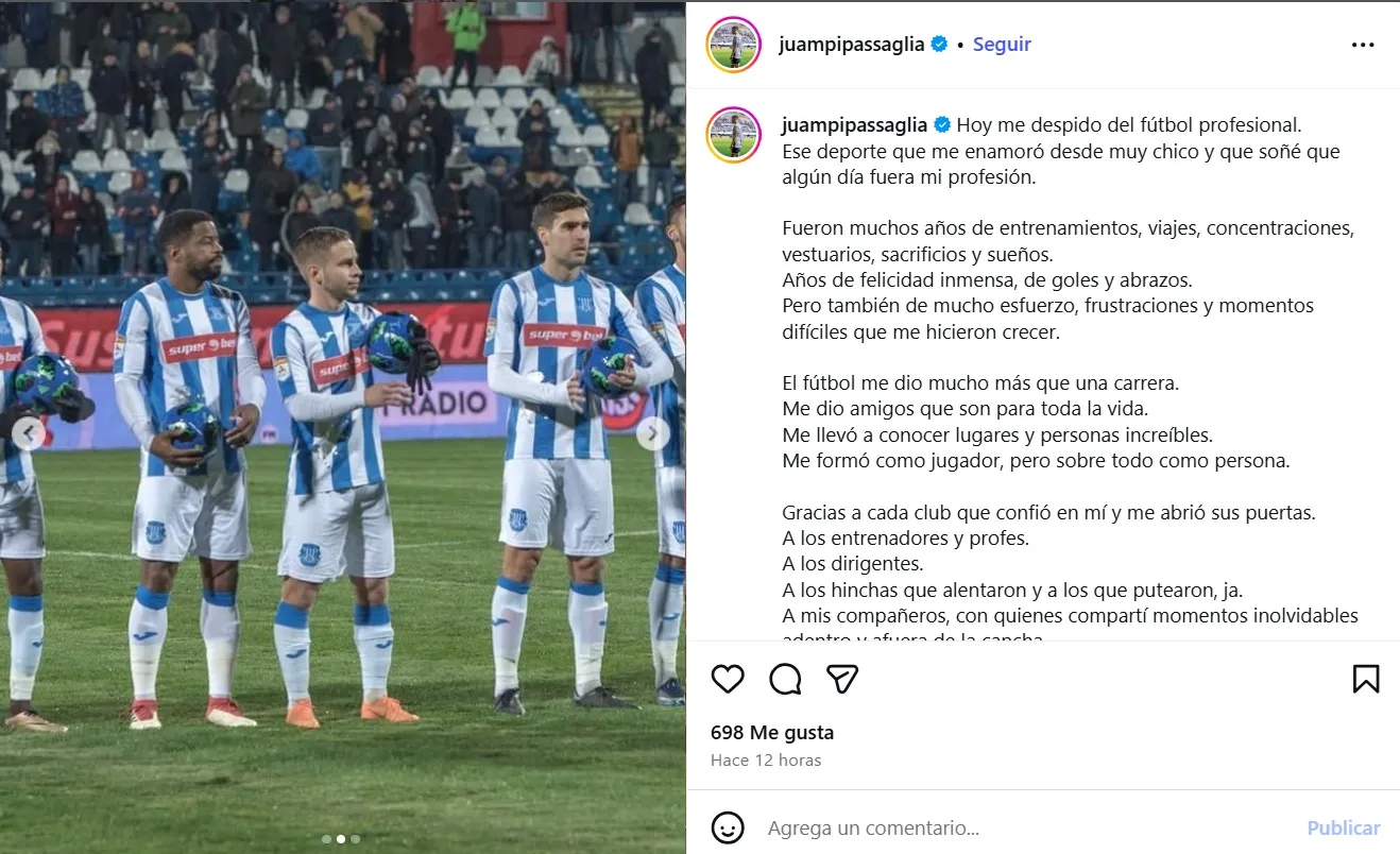 “Hoy me despido del fútbol profesional. Ese deporte que me enamoró desde muy chico y que soñé que algún día fuera mi profesión. Fueron muchos años de entrenamientos, viajes, concentraciones, vestuarios, sacrificios y sueños. Años de felicidad inmensa, de goles y abrazos”, escribió en Instagram.