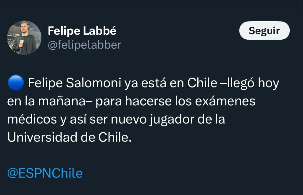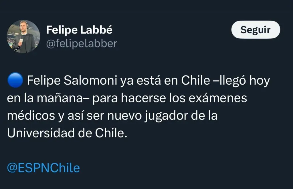 “Felipe Salomoni ya está en Chile. Llegó hoy en la mañana para hacerse los exámenes médicos y así ser nuevo jugador de Universidad de Chile”, detalló el periodista.