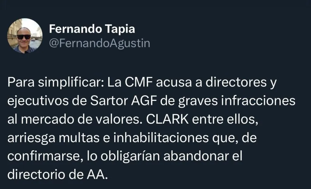 “Para simplificar: La CMF acusa a directores y ejecutivos de Sartor de graves infracciones al mercado de valores. Clark, entre ellos, arriesga multas e inhabilitaciones que, de confirmarse, lo obligarían a abandonar el directorio de Azul Azul”, detalló.