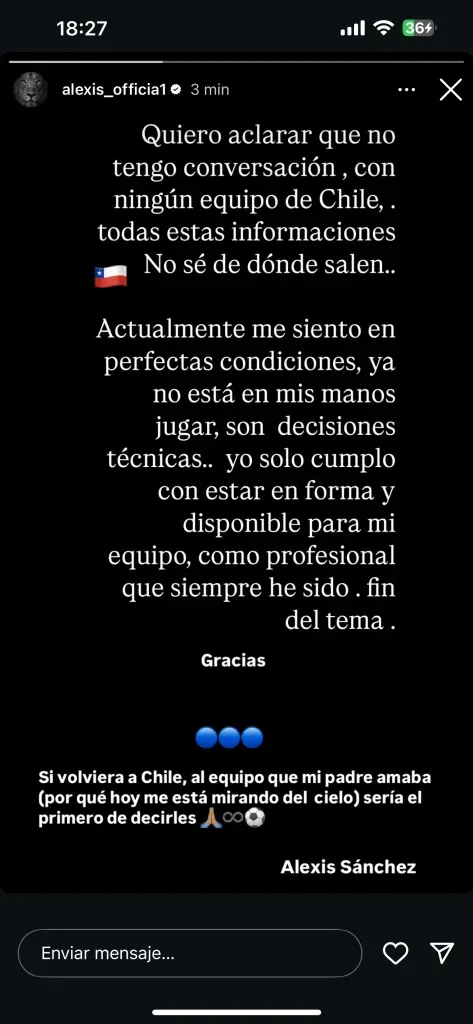A pesar de todo lo anterior, Alexis Sánchez dejó abierta la opción de llegar a Universidad de Chile en un futuro, aunque indicó que será él quien lo informe. “Si volviera a Chile, al equipo que mi padre amaba (porque hoy me está mirando del cielo), sería el primero en decirles”, cerró, junto con agregar emojis azules.
