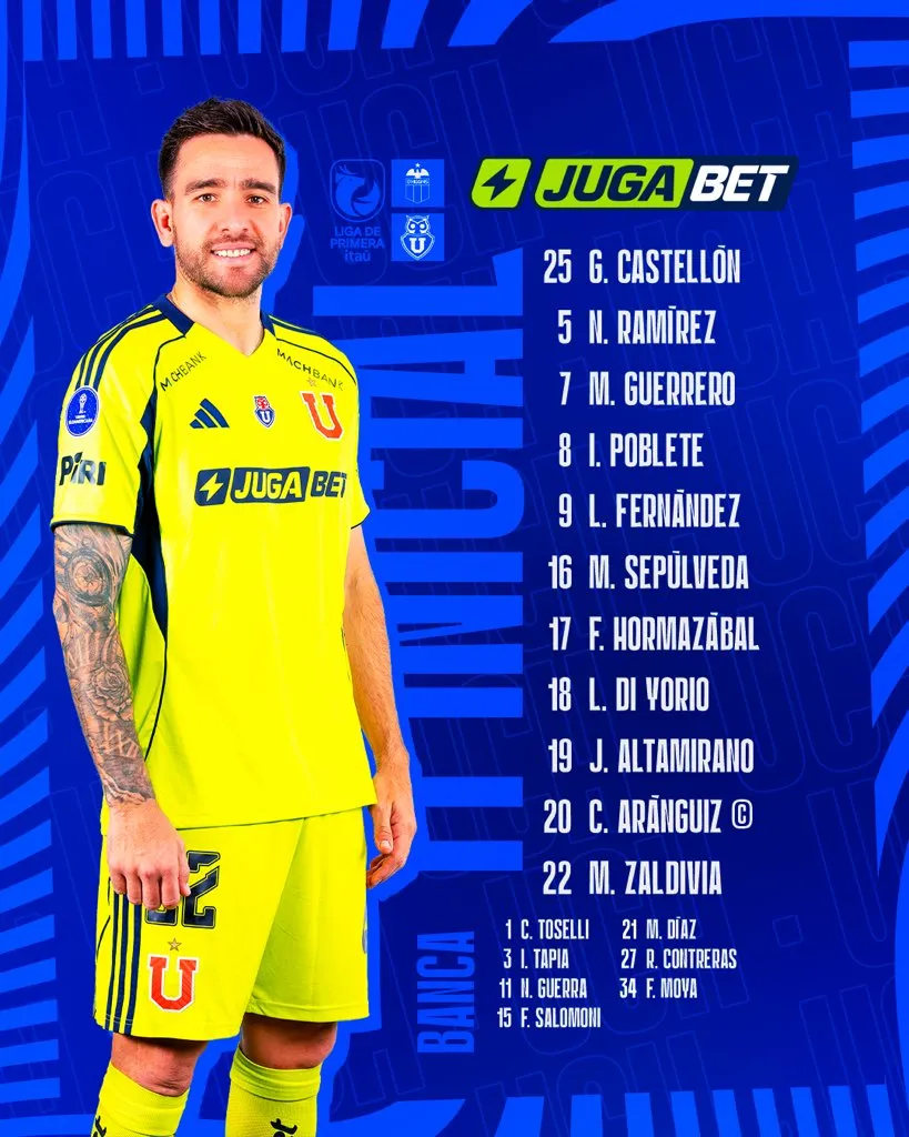 Según confirmó su técnico Gustavo Álvarez, Universidad de Chile salta a la cancha con Gabriel Castellón en el arco; Fabián Hormazábal, Nicolás Ramírez y Matías Zaldivia en defensa; Maximiliano Guerrero, Israel Poblete, Charles Aránguiz, Matías Sepúlveda; Javier Altamirano en mediocampo; Lucas Di Yorio y Leandro Fernández en delantera.