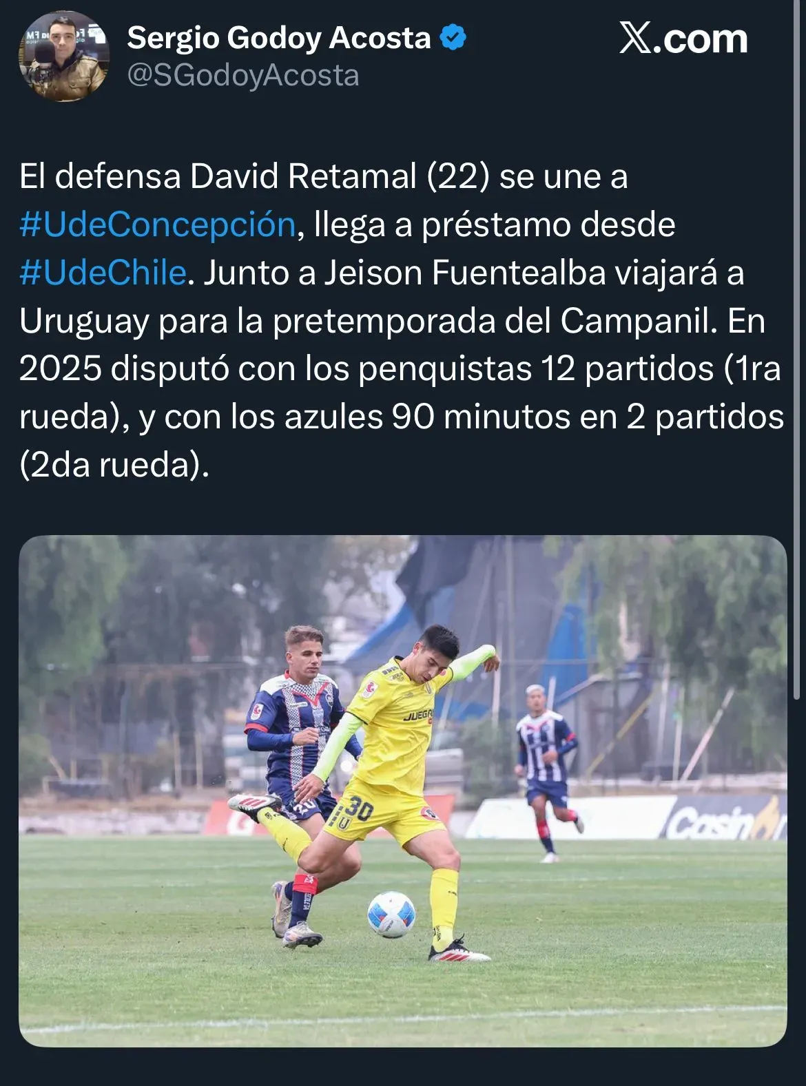 “El defensa David Retamal (22) se une a Universidad de Concepción, llega a préstamo desde Universidad de Chile. Junto a Jeison Fuentealba viajará a Uruguay para la pretemporada del Campanil”, explicó.