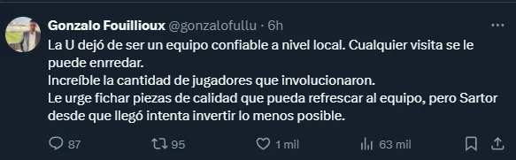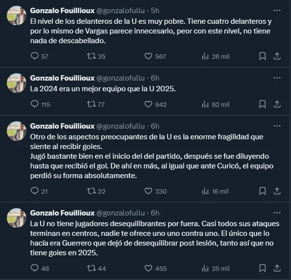 “El nivel de los delanteros de la U es muy pobre. Tiene cuatro delanteros y por lo mismo de Vargas parece innecesario, peor con este nivel, no tiene nada de descabellado”, parte Gonzalo en X.